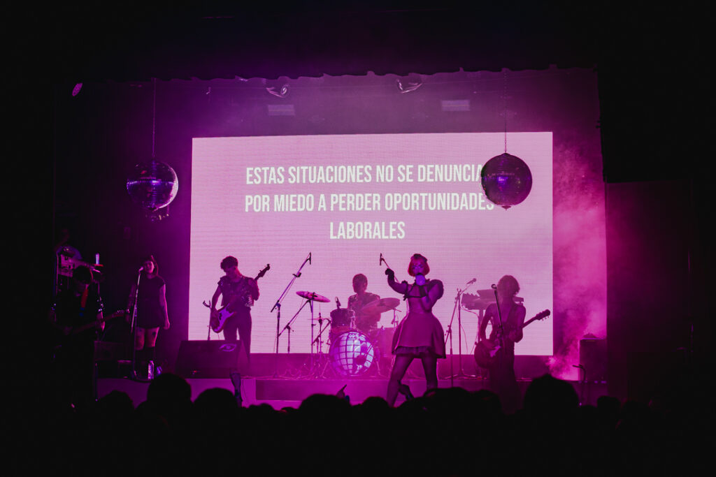 En este tramo, el show tocó techo: alcanzó su pico en mensajes, canciones y visuales. La primera visual completamente significativa para ejemplificar la escena actual ocurre durante “N.E.N.A. (No entendiste nada amor)”, con mensajes que describen hechos actuales sobre cómo la mujer se sitúa en el under o en la escena local. A esto acompaña el ritmo de la canción, que se aleja del pop para transformarse en un grito punk rebelde. Momento clave de la noche y de cómo se ve Homogénica a sí misma como banda.